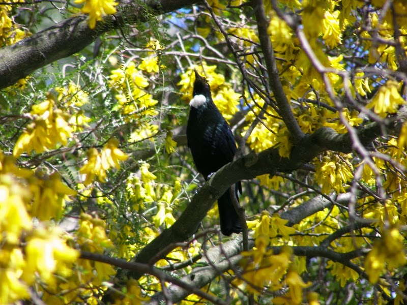(NZの固有の花にはNZ固有種の鳥が蜜を求めてやって来ます。こののどのあたりに白い雪洞をつけるトゥイ(Tui)はその中でもNZ全国で見られて、さえずりの声がまた気持ちのいいものなのでとても人気のある鳥です。)